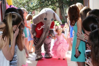 From time to time, we receive requests from the community to participate in special causes. We are always happy to give back, and we would like to share this very special story with you. Back in March, we received an email from the Chi Omega house of the University of Alabama.  This group of college women is very much involved in philanthropy. One of the organizations that they sponsor is the Make-A-Wish Foundation, the charity that grants the wishes of children battling terminal illnesses.  One of those children is three-year-old Mikayla. Mikayla has Acute Lymphoblastic Leukemia, a childhood cancer in which the bone marrow makes too many immature lymphocytes (a type of white blood cell).  Mikayla loves princesses, and her wish was to go to Disney World. Chi Omega was going to help grant Mikayla's wish. As part of sending Mikayla to Disney World, the Chi Omega house wanted to host a "Wish Granting Party." It was going to be a princess ball, and Mikayla was going to wear her dream dress to the ball. This is where we came in. Chi Omega asked us if we would donate the dress. Of course we said yes! A perfect dress was picked out. It was pink, princess-y, and just a dream of a dress. We were honored to be able to give this dress to Mikayla and be a part of making her wish come true. So on April 9, Mikayla got to be a princess for the day! She got to go to a local hair and nails spa and receive the royal treatment. Then, to complete her princess look, Mikayla got dressed up in our Pink Cinderella Dress, picked up by a limo and whisked away to the Chi Omega house for the princess ball. Princess Mikayla arrived at the party by a grand entrance on a red carpet with Big Al (mascot of the University of Alabama Crimson Tide) as her escort. The party was filled with food, fun, and friends!   Mikayla, we think you are an absolutely beautiful princess.  We are honored that we got to be a part of your special wish. We are rooting for you and keeping you in our prayers!